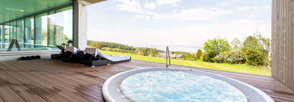 The bubbling experience outside (covered). Lake Constance on the horizon, the cows in front of the pool, here you can relax with a marvellous view.